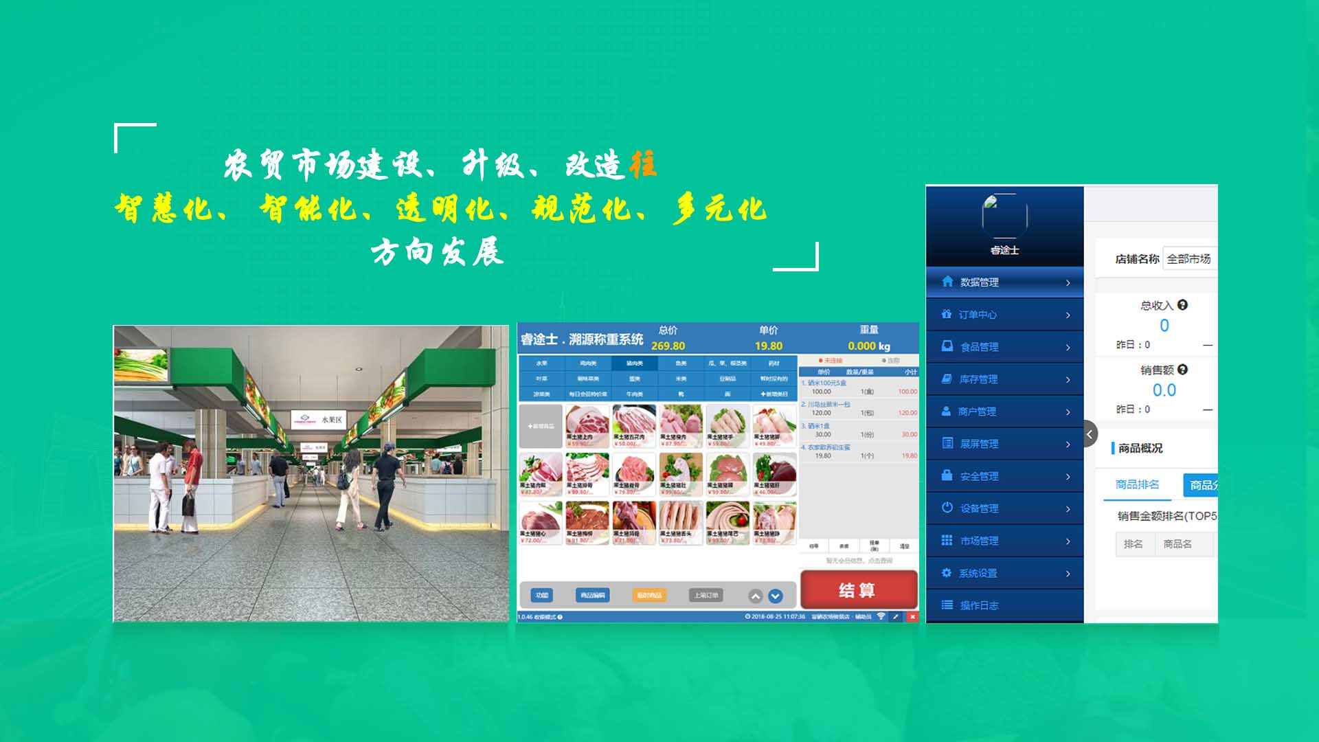 睿途士顛覆傳統(tǒng)的智慧農(nóng)貿(mào)溯源系統(tǒng),創(chuàng)新實(shí)現(xiàn)了【智慧農(nóng)貿(mào)溯源管理系統(tǒng)】與【智能稱重收銀】 一體化解決方案,集市場監(jiān)管、市場管理、運(yùn)營管理、智能收銀、 溯源追溯、線上買菜、大數(shù)據(jù)運(yùn)用于一體,硬件、軟件與管理系統(tǒng)完美結(jié)合。